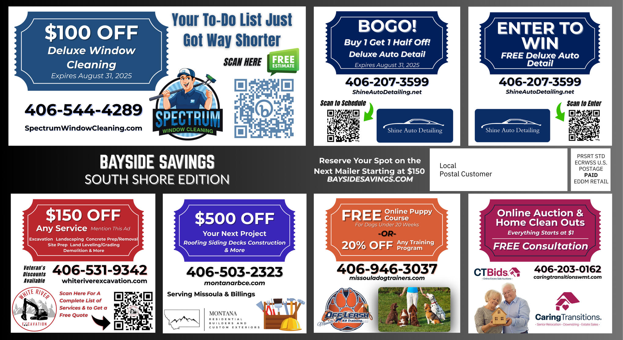 Our first postcard, targeting 2,500 households in the South Shore Harbour area, will go out on March 15. Ad spots start at $150. The final postcard will look similar to this graphic, with ads printed on both sides.
